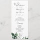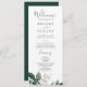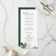 Ce programme de mariage vert émeraude est parfait pour un mariage de boho. Le design élégant et rustique présente des feuilles d'aquarelle vert foncé moody et des eucalyptus aux tons bohèmes modernes. Inclure le nom de la mariée et du marié, la date et le lieu du mariage, le message de remerciement, l'ordre de service, la fête de la mariée et un mémorial optionnel "en mémoire d'amour".
