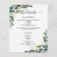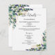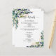 Un mariage moderne, élégant détails / programme / chronologie. Un arrière - plan blanc décoré de verdure d'eucalyptus et de feuillage doré. Personnalisez et ajoutez vos noms et les détails du mariage. Lettres de couleur noire. Texte des deux côtés. 1 feuille = 1 programme imprimé de bord en bord.