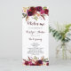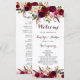 Carte de programme de mariage de style bohème avec une illustration aquarelle de pivoines et de roses bourguignon, rouge et rose avec accent de plumes. Ceci est parfait pour l'automne | automne et l'invitation de mariage d'hiver. Les articles assortis sont également disponibles.