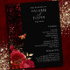 Programme de mariage floral rouge et noir gothique. Feuilles de feuille d'or fausses. Police de caractères script mise en valeur avec une police de nom serif facile à lire. Facile à adapter à vos propres besoins de mariage.
