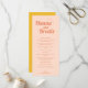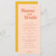 Un programme de mariage avec typographie orange rétro est un choix élégant et unique pour une occasion spéciale. Les lettres orange vif et audacieuses se démarquent de l'arrière - plan pêche léger, créant un contraste visuel saisissant. Le programme est encore renforcé par l'ajout de détails sur le design du soleil et des fleurs, ajoutant une touche de fantaisie et de jouabilité à la conception globale. Le soleil et les fleurs ajoutent une ambiance joyeuse et joyeuse à l'invitation, ce qui le rend parfait pour une fête mariage amusante et mémorable. Le dos est d'une couleur jaune vif et joyeuse avec des détails supplémentaires sur votre jour de mariage.