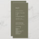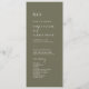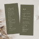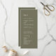 Ce programme de mariage minimaliste et chic vert olive plat est parfait pour un mariage simple. Le design boisé boho comprend une typographie bohème rustique unique et élégante dans une couleur verte boisée minimale. Inclure le nom de la mariée et du marié, la date et le lieu du mariage, le message de remerciement, l'ordre de service, la fête de la mariée et un mémorial optionnel "en mémoire d'amour".
