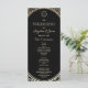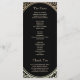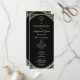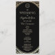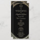 Élégant programme de mariage noir chic avec des tourbillons floraux d'or cadre art-déco et monogramme au sommet.
