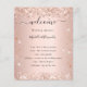 Un programme de mariage moderne et élégant, timeline. Fond de couleur rose et or rose décoré de fausse poussière pailletée. Personnalisez et ajoutez vos noms et détails de mariage. Lettres de couleur noire. Si vous avez plus de texte, il est possible de réduire l'espace entre les lignes.