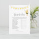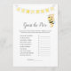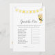 Un jeu amusant pour le baby shower est le Guess le jeu de prix. Ce jeu comporte une bannière jaune au sommet et un ours en peluche avec une abeille. Au verso, un ours en peluche s'appuie sur un tonneau de miel en regardant une abeille au miel avec des modèles.