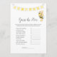 Un jeu amusant pour le baby shower est le Guess le jeu de prix. Ce jeu comporte une bannière jaune au sommet et un ours en peluche avec une abeille au miel. Au verso, une petite ours en peluche se penche sur un tonneau de miel en regardant une abeille au miel avec des modèles.