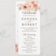 Ce magnifique programme de mariage présente des roses roses de corail accentuées de feuilles d'or et de branches. Le texte brun foncé s'harmonise parfaitement avec les motifs floraux rose et or. Le devant présente les noms du couple, la date et l'emplacement du mariage, ainsi que les détails de la cérémonie. Le dos affiche les noms de la fête de mariage. Tous les détails, y compris la couleur du texte, sont entièrement personnalisables. Veuillez noter que les feuilles d'or ne sont pas des feuilles d'or et ne seront pas brillants sur le programme imprimé.