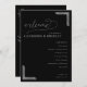 This elegant wedding program features a sophisticated black and white color palette, creating a timeless and classic feel. The design showcases a balanced layout with centered elements, including a flowing cursive script for the word "welcome" and bold serif fonts for the names, adding visual interest and readability. Decorative corner accents provide a touch of sophistication without overwhelming the clean lines and negative space. Perfect for formal weddings, this program conveys refinement and celebration through its tasteful typography and minimalist aesthetic.
