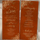 Ce magnifique programme de mariage présente un design élégant avec du texte en or sur une rouille orange ou un arrière - plan couleur couleur nombre brûlé et des boucles et tourbillons en faux feuille doré en dentelle dans les coins. Les titres sont écrits en calligraphie de script sophistiquée, et il y a de l'espace pour vos détails de cérémonie et de mariage, ainsi qu'un bref merci pour vos invités. Merveilleuse façon d'accueillir vos amis et votre famille à votre fête mariage.