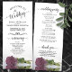 Ce magnifique programme de mariage présente un design élégant avec un seul rose à longue tige poussiéreux ou rose rose mauve allongé sur son côté réfléchissant dans l'eau. Les titres sont écrits en calligraphie de script sophistiquée, et il y a de l'espace pour vos détails de cérémonie et de mariage, ainsi qu'un bref merci pour vos invités. Merveilleuse façon d'accueillir vos amis et votre famille à votre fête mariage.