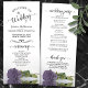 Ce magnifique programme de mariage présente un design élégant avec une seule longue tige de violet poussiéreux, lavande ou rose couleur bruyère couché sur son côté réfléchissant dans l'eau. Les titres sont écrits en calligraphie de script sophistiquée, et il y a de l'espace pour vos détails de cérémonie et de mariage, ainsi qu'un bref merci pour vos invités. Merveilleuse façon d'accueillir vos amis et votre famille à votre fête mariage.