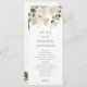 Élégants programmes de mariage avec des fleurs d'aquarelle blanche et de verdure : Ce programme de mariage comprend un magnifique bouquet d'aquarelle blanc fleuri et vert / feuillage en haut. Le dos a de la place pour votre mariage avec un message de remerciement ou en mémoire en bas.