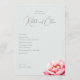 This wedding program features a minimalist and elegant design with a soft pastel color palette of light mint green and blush pink. The layout is balanced, with ample negative space around the flowing cursive script for names and a clean serif font detailing the ceremony schedule. A large, detailed watercolor-style peony flower adds a touch of natural elegance to the bottom right corner, enhancing the romantic and refined theme. Perfect for a formal event, this design conveys a serene and sophisticated atmosphere, ideal for celebrating love and commitment.