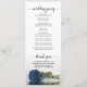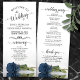 Ce magnifique programme de mariage présente un design élégant avec un seul rose à long tige en acier poussiéreux bleu ou bleu gris allongé sur son côté réfléchissant dans l'eau. Les titres sont écrits en calligraphie de script sophistiquée, et il y a de l'espace pour vos détails de cérémonie et de mariage, ainsi qu'un bref merci pour vos invités. Merveilleuse façon d'accueillir vos amis et votre famille à votre fête mariage.