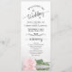 Ce magnifique programme de mariage présente un design élégant avec un seul rose à long tige rose pâle pâle pâle, allongé sur son côté réfléchissant dans l'eau. Les titres sont écrits en calligraphie de script sophistiquée, et il y a de l'espace pour vos détails de cérémonie et de mariage, ainsi qu'un bref merci pour vos invités. Merveilleuse façon d'accueillir vos amis et votre famille à votre fête mariage.