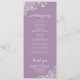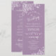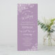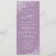 Ce magnifique programme de mariage présente un design élégant avec du texte blanc sur un arrière - plan couleur violet clair ou lavande et des boucles et tourbillons blancs en dentelle dans les coins. Les titres sont écrits en calligraphie de script sophistiquée, et il y a de l'espace pour vos détails de cérémonie et de mariage, ainsi qu'un bref merci pour vos invités. Merveilleuse façon d'accueillir vos amis et votre famille à votre fête mariage.