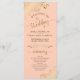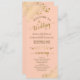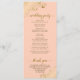 Ce magnifique programme de mariage présente un design élégant avec du texte doré sur un arrière - plan couleur orange pâle ou corail pêche et des boucles et tourbillons en faux feuille doré dentés dans les coins. Les titres sont écrits en calligraphie de script sophistiquée, et il y a de l'espace pour vos détails de cérémonie et de mariage, ainsi qu'un bref merci pour votre invité. Merveilleuse façon d'accueillir vos amis et votre famille à votre fête mariage.