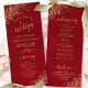 Ce magnifique programme de mariage présente un design élégant avec du texte doré sur un arrière - plan rouge crimson et des boucles et tourbillons en faux feuille doré en dentelle dans les coins. Les titres sont écrits en calligraphie de script sophistiquée, et il y a de l'espace pour vos détails de cérémonie et de mariage, ainsi qu'un bref merci pour vos invités. Merveilleuse façon d'accueillir vos amis et votre famille à votre fête mariage.