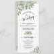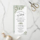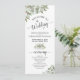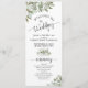 Cet élégant programme de mariage présente un design boho chic rustique avec des sprigs peints à la main de feuilles d'eucalyptus, de feuillage et de verdure dans les tons menthe, mousse et vert sauge. Les titres sont écrits en calligraphie de script sophistiquée, et il y a de l'espace pour vos détails de cérémonie et de mariage, ainsi qu'un bref merci pour votre invité. Merveilleuse façon d'accueillir vos amis et votre famille à votre fête mariage.