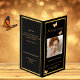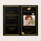 Un programme élégant de 4 pages. Un arrière - plan noir, un cadre en faux or et un espace pour votre photo. Décoré de 3 papillons dorés. Personnalisez et ajoutez le nom, les dates et votre texte.