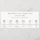 Moderne minimaliste, icônes de jour de mariage, programme d'itinéraire chronologique. Caractéristiques, bagues, cocktail, mariée et mariée, dîner, note de musique et icônes de confettis. Lignes de texte modèles pour personnaliser les heures et les titres de chaque icône.