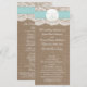 La collection de mariage de plage de sable turquoise dollar est un design époustouflant avec un bel arrière - plan rustique effet burlap avec un habillage romantique vintage effet dentelle blanche terminé avec un dollar de sable étonnant et ruban turquoise. Ces programmes peuvent être personnalisés pour votre occasion spéciale et feraient le modèle parfait pour les mariages, douches nuptiales, fêtes de fiançailles, fêtes d'anniversaire et bien plus encore. *Veuillez noter que Zazzle ne vend que des produits imprimés, de sorte que cet article n'a pas de véritables boucles, dentelles, dollars de sable ou rubans.