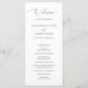Programme de mariage blanc classique avec "bienvenue" dans un script délicat. Utilisez le modèle pour ajouter facilement votre ordre de cérémonie au devant et à votre fête de mariage et un message de remerciement au dos. Une disposition simple sans aucun graphisme en fait un design élégant et intemporel, parfait pour un mariage formel.