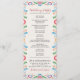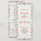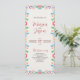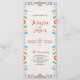 Ce design mexicain élégant Floral Fiesta Wedding Program présente une grande disposition rectangulaire avec un arrière - plan texturé crème encadré de bordures florales vives et symétriques. Des couleurs vives comme le rouge, le bleu, l'orange, le violet, le vert et le jaune créent une atmosphère énergique et festive avec des fleurs décoratives, des feuilles, des tourbillons et des accents de maracas. L'espace vierge central est propre et épuré, ce qui le rend parfait pour mettre en évidence des textes importants tels que des invitations, des programmes d'événements ou des annonces festives.