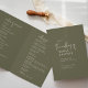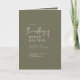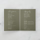 Ce programme de mariage moderne et chic vert olive plié est parfait pour un mariage simple. Le design boisé boho comprend une typographie bohème rustique unique et élégante dans une couleur verte boisée minimale.