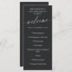 Un programme de fête d'anniversaire noir mat avec des polices élégantes et un script de calligraphie délicat écrit bienvenue en haut du programme. Ajoutez votre programme, la date et le nom de la personne qui célèbre son anniversaire. Propre, simple, intemporel et élégant.