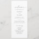 Ce programme de mariage en argent moderne est parfait pour un mariage minimaliste. Le design de couleur gris argenté simple présente une typographie industrielle unique avec un style boho moderne. Personnalisable dans n'importe quelle couleur. Gardez le design minimal et élégant, en l'état, ou personnalisez-le en ajoutant vos propres graphiques et artwork. Inclure le nom de la mariée et du marié, la date et le lieu du mariage, le message de remerciement, l'ordre de service, la fête de la mariée et un mémorial optionnel "en mémoire d'amour".