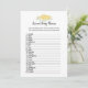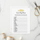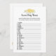 Un jeu amusant pour la partie révélateur de genre est le jeu de noms de bébé animal. Cette carte de jeu présente des fleurs jaunes en haut. Au verso, un ours en peluche, appuyé sur un tonneau de miel, regarde une abeille au miel avec des modèles.