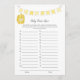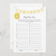 Un jeu amusant pour le baby shower est le jeu de course de nom Baby. Ce jeu comporte une bannière jaune en haut et un tonneau de miel. Au verso, un ours en peluche s'appuie sur un tonneau de miel en regardant une abeille au miel avec des modèles.