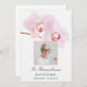 Souvenez-vous de votre être cher et célébrez leur vie avec l'élégant et simple programme de service commémoratif de l'orchidée rose sur White Funeral. Cette ligne de service de tribut de mort fleurie personnalisée classe présente une photo florale sereine et sophistiquée de fleurs d'orchidées de phalaenopsis rose clair sur la tige avec un arrière - plan blanc. Customisez-le avec une photo du défunt, les dates de naissance et de décès et l'ordre de cérémonie de leur célébration de la vie église service.