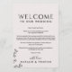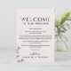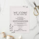 Ces cartes de bienvenue en typographie florale et d'itinéraire sont parfaites pour un mariage élégant. Le design romantique présente une écriture simple ornée de fleurs, de bordures botaniques et d'un fond rose subtil. Le recto de la carte présente une lettre de bienvenue et le verso présente l'itinéraire du mariage. Ces notes sont parfaites pour les mariages de destination et les sacs de bienvenue pour les invités d'hôtel.
