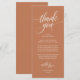 Ajoutez une touche personnelle et attentive à votre célébration mariage avec ce script moderne en terre cuite brun cuivre Placer Setting Carte de remerciements. Conçu pour être placé sur le siège de chaque client, cet élégant papier à lettres mariage vous aide à vous exprimer votre gratitude express et crée une atmosphère chaleureuse et accueillante. Avec son écriture moderne, il est parfait pour rehausser votre décor de dîner, de réception ou de dîner de répétition mariage. Customisez avec vos noms, votre date de mariage ou un message spécial pour en faire le vôtre. Une belle tenue pour que les clients puissent se souvenir de leur journée, cette carte est un détail élégant qui complète le thème rustique moderne.