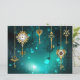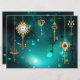 Or, clés antiques avec engrenages et cadrans accrochés sur chaînes dorées sur arrière - plan vert lumineux.