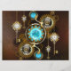 Turquoise lenses with antique watch with brass gears and golden keys on rusty, brown background. Steampunk style.