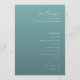 This elegant wedding program features a minimalist design with a calming teal background and crisp white text. The layout is clean and organized, showcasing the ceremony schedule in a simple sans-serif font that ensures readability. A mix of cursive and bold uppercase fonts highlights key elements like "welcome" and the names, adding a personal touch. Perfect for couples seeking a modern and understated aesthetic, this program conveys sophistication while keeping the focus on the special day's details.