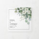 Branches d'Eycalyptus avec fleurs blanches mariage à fleurs florales Programme Tri-Fold. Il présente des branches d'eucalyptus ornées de fleurs blanches et de verdure, dans un élégant thème printanier. Le design présente des branches aux fleurs blanches et des feuilles verts sauge aux coins, tandis que le centre intérieur affiche une photo de couple. Les noms sont présentés dans la typographie décorative, et chaque panneau est encadré de fines bordures noires.