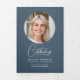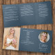 Un modèle moderne en ardoise bleu et blanc triple célébration du programme de vie avec un agencement élégant et minimaliste conçu pour honorer un être cher avec élégance et clarté. Le devant comprend une photo ronde personnalisée, avec le nom et les dates de vie de l'être cher présenté dans un mélange raffiné de serif et de typographie de script. Les panneaux intérieurs sont bien structurés pour guider les invités dans l'ordre de service, avec des sections dédiées pour les lectures, les hommages ou les éulogies, et un espace dédié de reconnaissance pour les porteurs de palettes, les fournisseurs de services et les expressions de gratitude. Ce design contemporain et digne est idéal pour les services commémoratifs ou la célébration d'événements de la vie, offrant un hommage professionnel et sincère.