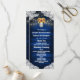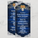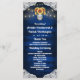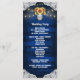 Programmes de mariage en jarre de maçon en bois de tournesol - comportent un fond en bois de grange bleu bordé de dentelle et décoré de lumières scintillantes à cordon de couleur chaude. Le design présente également un bouquet de tournesols à l'intérieur d'un pot Mason que vous pouvez personnaliser avec les initiales de votre choix.