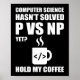 Diese lustige Computerwissenschaftssoftware & Web-Entwickler-Design lautet: "Die Informatik hat noch nicht p vs np gelöst? Halten Sie meinen Kaffee".Das Design enthält einen Kaffee.
