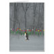 Le pingouin adorable faisant un tour dans les bois neigeux se demande si c'est presque ressort ! Paysage hivernal rempli de neige et d'arbres, pointillés avec des tulipes pour garder la société de pingouin.