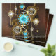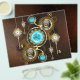 Turquoise lenses with antique watch with brass gears and golden keys on rusty, brown background. Steampunk style.