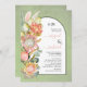 Tropische Protea Blume Pampas Gras und Eukalyprus Blätter Sala grüne Bogen Hochzeit Einladung mit QR-Code. Dieses schöne Hochzeitsdesign besticht durch einen Bogenrahmen auf grünem, farbigem Hintergrund mit Ihren Initalien und Text. Auf den verlassen gibt es Protea-Blume, Pampas-Gras und Eukalyptus-Blätter. Die Rückseite enthält Ihren QR-Code für UAWG.