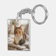 Celebrate the bond between a feline and their human with this Proud Cat Dad Father's Day Double-Sided Keychain. The front design features a charming orange tabby cat illustration paired with retro 1970s-style bubble typography in warm gold and brown tones. The reverse side is a functional photo template, allowing for the addition of a pet portrait.