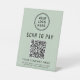 Modernes, grünes Tischschild für Ihr Unternehmen mit einem QR-Code, den Kunden nach Zahlungen durchsuchen können, sodass Sie jederzeit und überall Zahlungen erhalten können. Laden Sie Ihr Logo hoch und fügen Sie Ihren Firmennamen, Ihre Telefonnummer und Straßenadresse oder andere Informationen in einfacher Typografie hinzu. Geben Sie Ihre Zahlungsadresse ein, um automatisch einen scannbaren QR-Code zu erstellen.