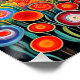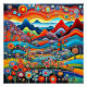 Die A.I. schuf die Interpretation einer hellen und lebendigen surrealen, psychedelischen Landschaft mit sanften Hügeln, Bergen und abstrakten Kreismustern, die Blume darstellen.