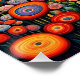Die A.I. schuf die Interpretation einer hellen und lebendigen surrealen, psychedelischen Landschaft mit sanften Hügeln, Bergen und abstrakten Kreismustern, die Blume darstellen.